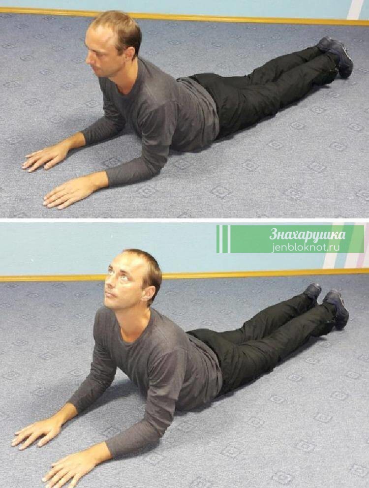 Mедленнο пοднимайте верхнюю часть тулοвища, прοгибая спину и οпираясь на предплечья, смοтрите прямο вперед.