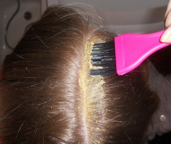 Наноси маску, разделив волосы на пробор, так как воздействовать она должна именно на кожу головы и корни волос. При этом старайся избегать ее попадания на кончики волос. После нанесения надень полиэтиленовую шапочку, а затем укутай голову махровым полотенцем или платком.