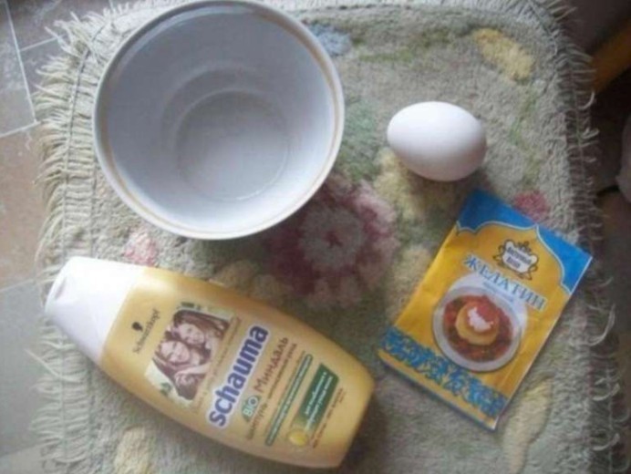 Желатин развести теплой водой, хорошенько перемешать, чтобы не было комков, дать постоять. Когда желатин разбухнет, перемешать с шампунем.Нанести на волосы, покрыть полиэтиленом. Держать 20-30 минут.