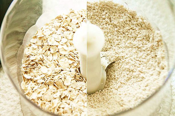 Чтобы получить овсяную муку, надо обычные хлопья смолоть кофемолкой. Также, муку из овса продают в магазинах. Сначала смешайте все ингредиенты.
