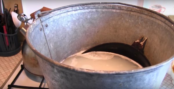 Чтобы убрать жирные пятна и потемнения с кастрюли, достаточно проварить ее в этом растворе 10 минут.