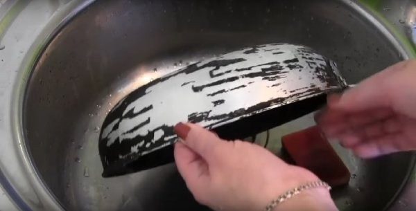 4. Если загрязнения очень сильные, то после проваривания необходимо завершить очищение при помощи жесткой губки, чтобы полностью удалить нагар.