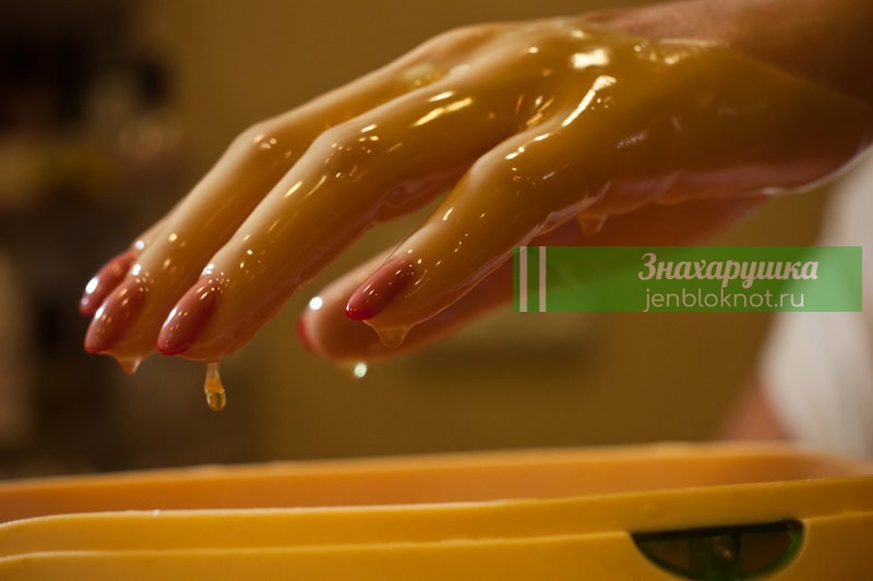 Держим руки в парафине секунд 8-10, вынимаем, держим на воздухе тоже секунд 8-10, опускаем в ванночку. Повторяем манипуляцию до 7 раз.