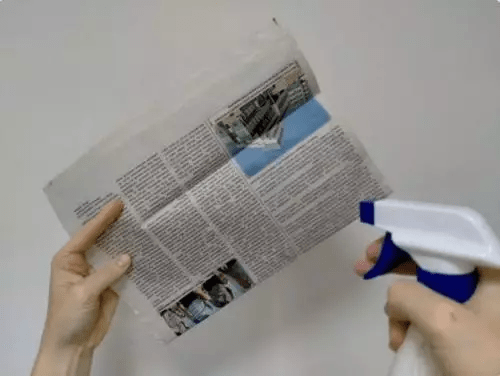 Газету лучше всего положить на тарелку или разделочную доску, поскольку ее края прилипают к поверхности, а на стекле остаются разводы от воды.